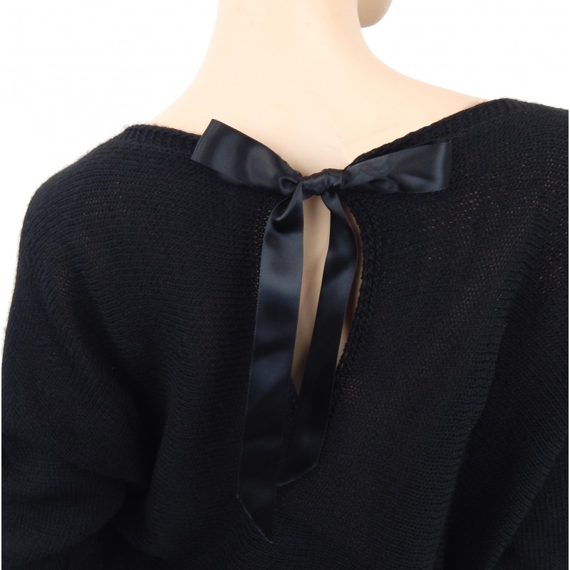 Der große Rundhalsausschnitt und die angesetzten 3/4-Ärmel verleihen dem Pullover eine moderne, feminine Silhouette. Ein besonderes Highlight ist der Rückenverschluss mit edler Satinschleife, der dem Design eine elegante und verspielte Note verleiht.