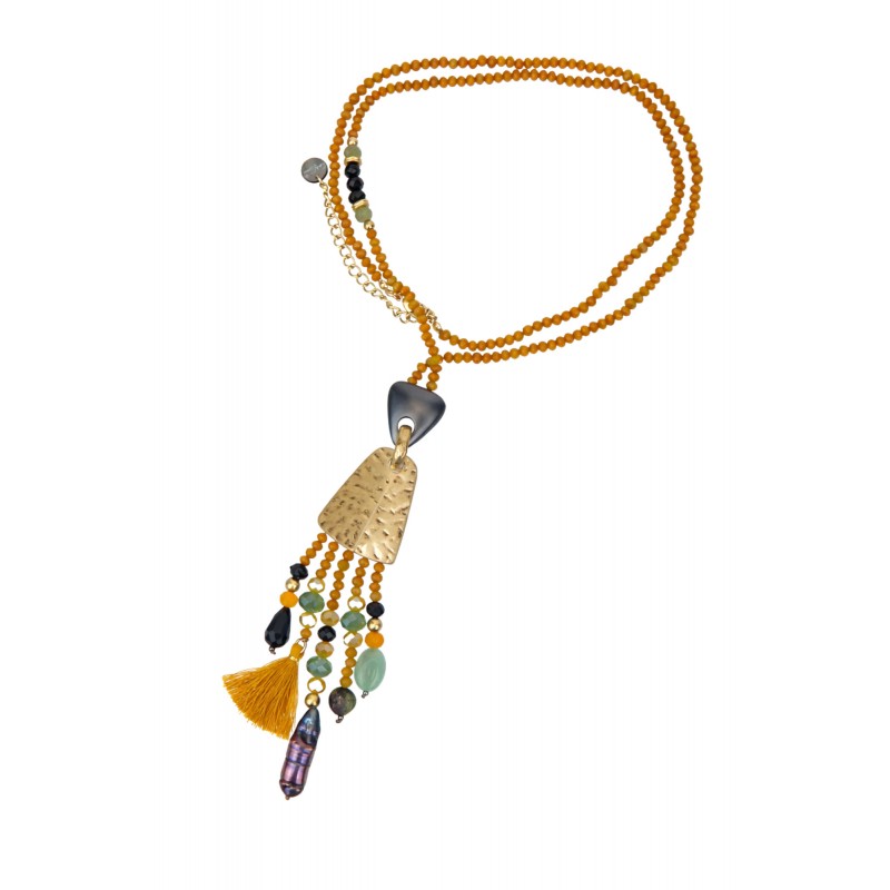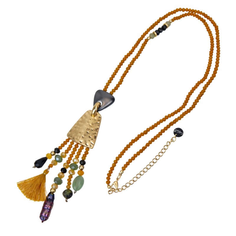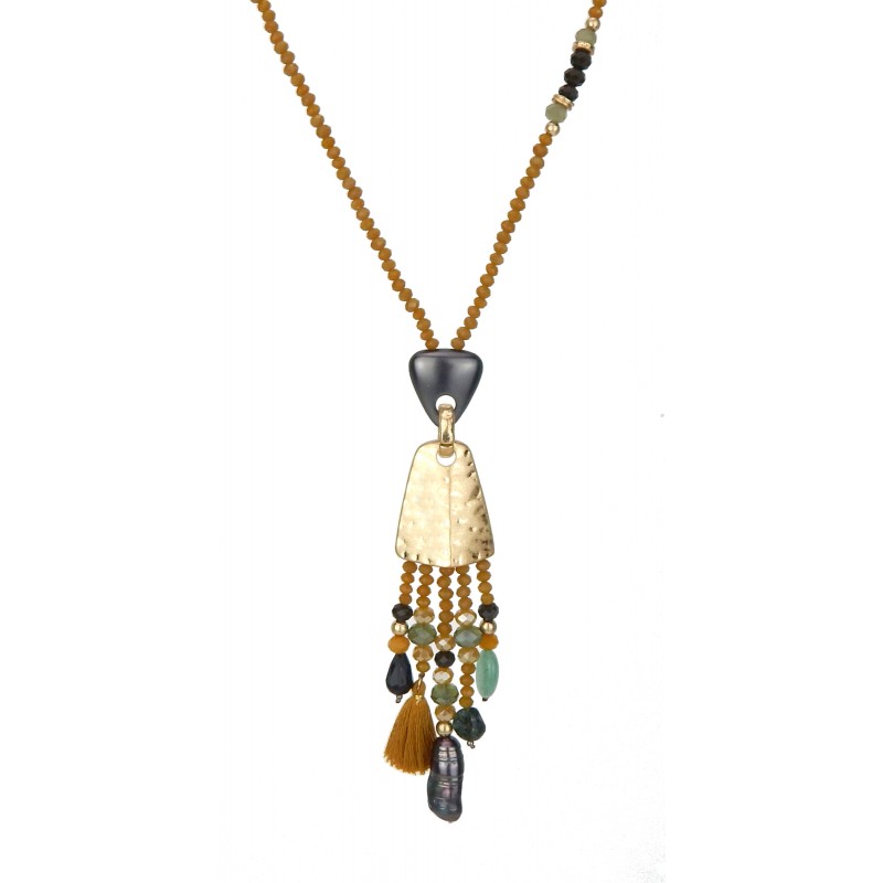 Handgefertigte lange Damenkette von Ella Jonte im angesagten Boho- & Ibiza-Style mit dekorativem Anhänger, Perlen - Quaste und farbenfrohen Details – ideal für sommerliche Looks.
